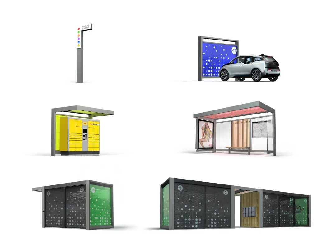 醒目的模块化设计,通过不同模块的组合,能够组成多种大型设施。每种模块类型均以不同的颜色编码,让行人轻松识别和区分各种功能,例如公交站、充电站、自行车停放设施等。