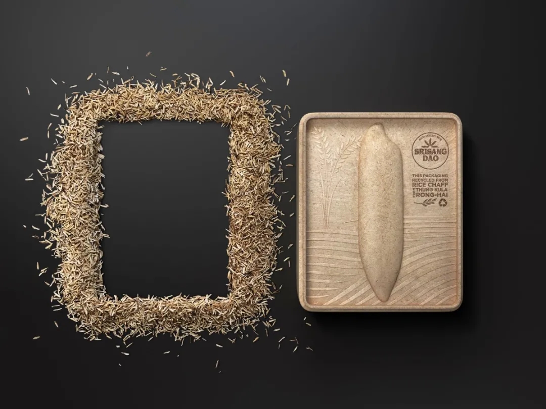 这种包装是用脱壳过程中产生的稻壳制成的,其内盖上有米粒形状的浮雕。盒子还可用作纸巾盒,非常环保。