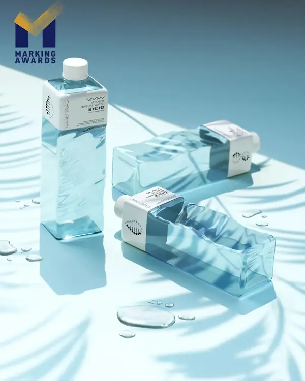 作品简介:KASEMRAD的包装灵感来自于真正的泉水,因此采用了带有溪流波纹的瓶形,让人联想到其原产地的自然风味。此外,标签选择以白色为主,象征维他命矿泉水的纯净。VMW一词也以波浪形的设计与DNA分子的结构相呼应。此外,标签侧面的图形也传达了水和维生素分子的关联。