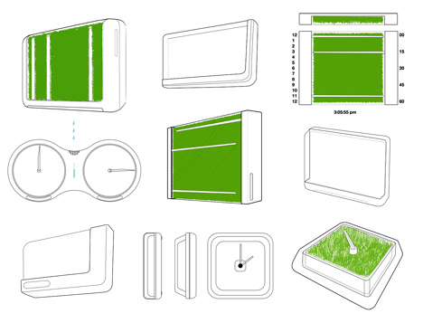 Researching for this article I came across the Treehugger post on Ustatic’s Wall Grass Concept. You must understand this concept before you can digest the Hour///Gras Living Wall Clock. Based on Ustatic’s theory that growing grass at home is beneficial, this concept clock encourages you to grow either grass or other suitable plants in a stainless steel and glass body frame and hang it on a wall. The hour and minute hand pass over the patch of grass and trim it via their sharpened edges and help maintain a pre-set level of grass-blade length.