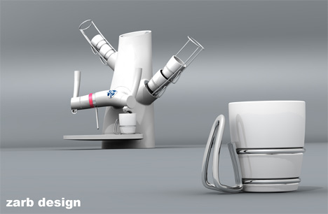 An espresso machine is a challenging object to design, on the one hand you have to innovate and appeal to the eye, and on the other hand it has to be pragmatic and intuitive to use as is the original design of an espresso machine.This design is about reconstructing the parts that make an espresso machine, while innovating in its curvature, without loosing its simplicity of use. All you need to do now is pick a cup out of its branch and make yourself a morning espresso.