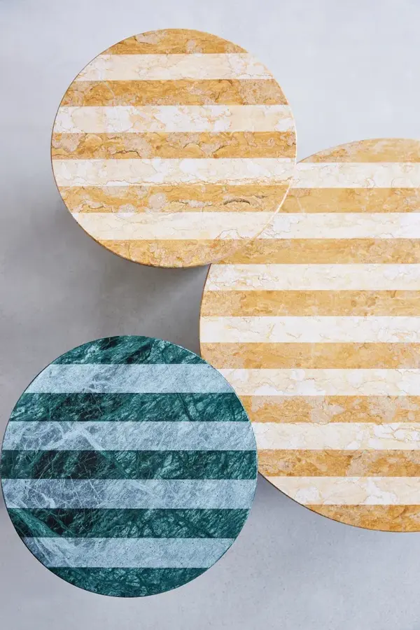 大理石桌面的纹理及其对比鲜明的表面结构让人想起石层,使桌面系列具有独特的外观。交替的生条纹和抛光条纹以两种不同的方式改变了材料的感觉和阴影。