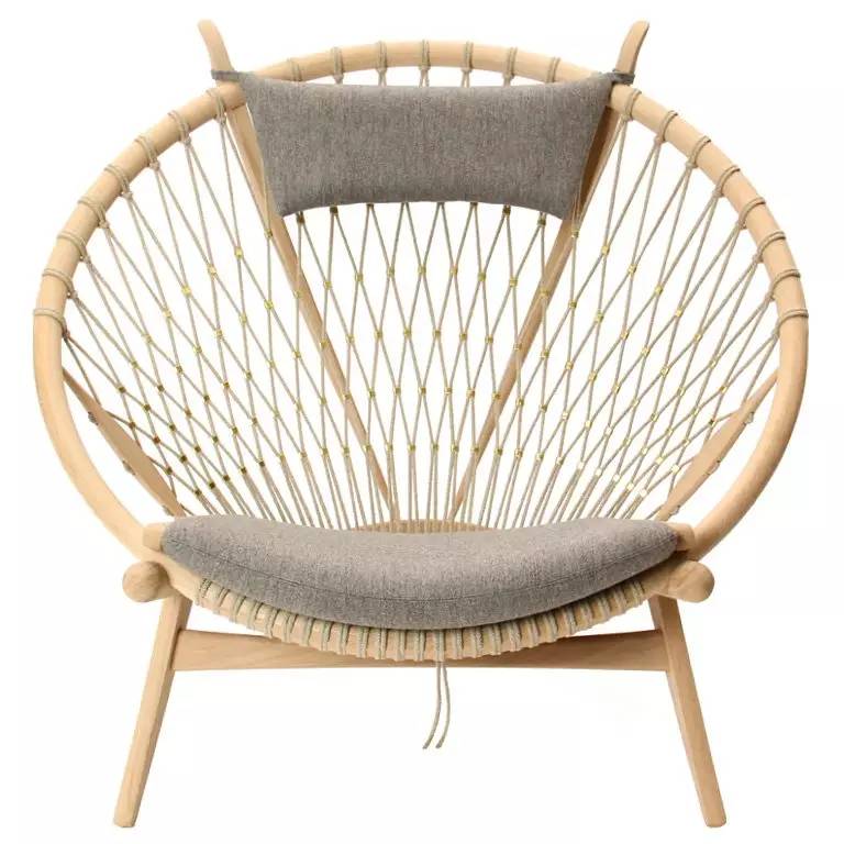圆椅,1986(72岁)年由丹麦的PP公司生产制造,是汉斯·韦格纳经典家具设计作品之一,由梣木、旗索和布垫组合而成。当人坐进去之后,环形的椅背造型可以使人体进入一个“环抱”的状态,旗索部分能有效为人体提供支撑,对于缓解腰部的压力非常有帮助,这一点从人体工程学的角度也向消费者做了一个很好的证明;同时,柔软的布垫也会使椅子坐起来更加舒适,这把椅子很好地体现了坚硬的木质构造与柔软的布垫质感的完美结合。