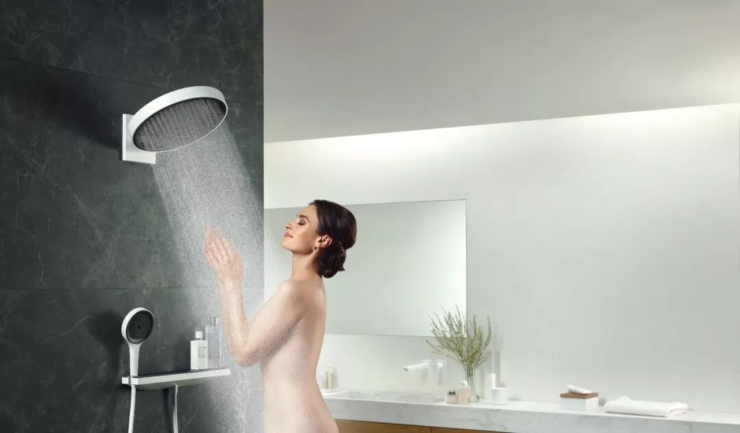 这一淋浴系统采用最新的“粉末雨”喷洒方式,可让人在不沾湿脸和头发的前提下,将身体从头到脚清洗干净。整个淋浴系统包括头顶花洒、手拿花洒及储物台,线条流畅和谐。
