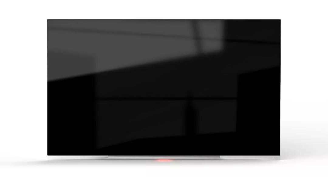 这款电视采用浮动屏设计,移除屏幕之外的任何元素,从正面看不到线缆,仿佛悬浮在空中,其实背后带有玻璃底座和隐形支架。