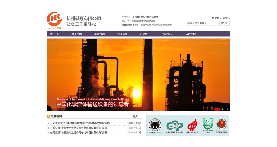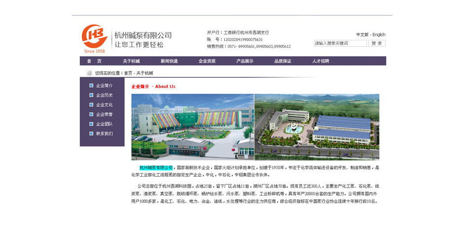 杭州碱泵有限公司,IJ化工流程泵,IFK氟塑料泵,AZ浆泵,HJD化工多级泵,SHJ低脉冲循环泵,MHT轻型渣浆泵,HZJ重型渣浆泵,FGD石灰石石膏脱硫泵 杭碱建于1958年,是国家高新技术企业, 国家火炬计划承担单位,化工部定点泵生产基地, 连续12年被评为AAA企业。生产化工泵,石化泵,纸浆泵,渣浆泵,循环泵,锅炉给水泵,污水泵,塑料泵,工业粉碎机等,广泛应用于化工、石化、电力、冶金、造纸、水处理等行业。