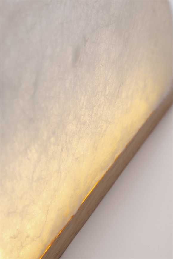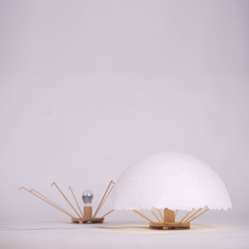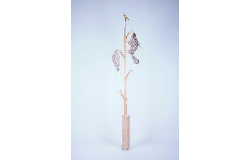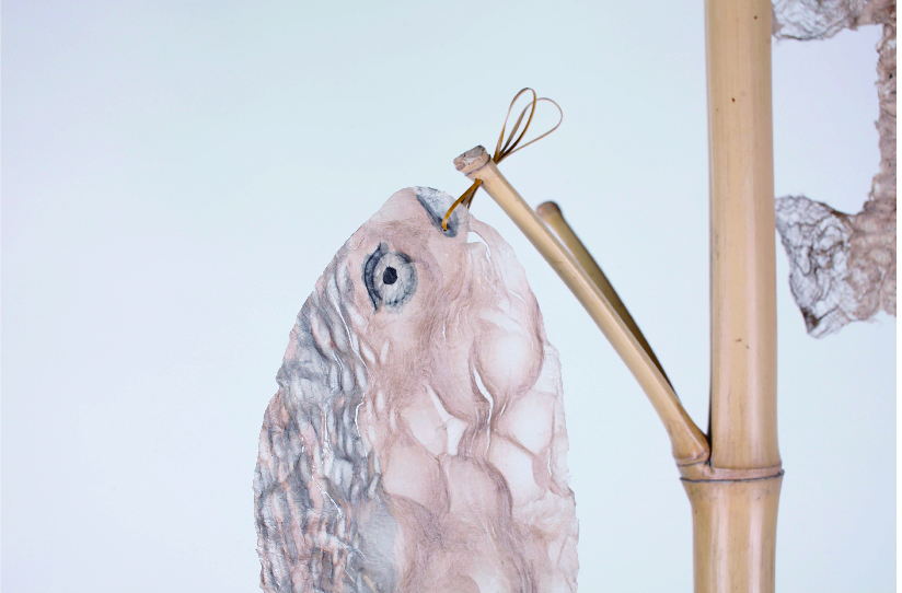 灵感来源于盛产竹子的中国南方农村晾晒用竹竿。以富阳大同村为例,村民保留竹子枝杈,常用来晾晒衣物、蔬菜、鱼等,并根据需要组合为可长可短的晾架、或剪切为悬挂在高处防止动物触碰食物的挂钩, 形成了对竹的自然、合理又有趣味的应用。 同时大同村作为有至少500年历史的手工造纸村落,许多村民世世代代为纸工,与纸有着一种亲切质朴的羁绊。的在这件作品中设计师以纸为鱼,以米为土,取鱼米之乡之意,结合竹创作出可观赏可挂物的盆景式置物架,希望再现这里的人们生活中一份自然、朴素、的记忆。