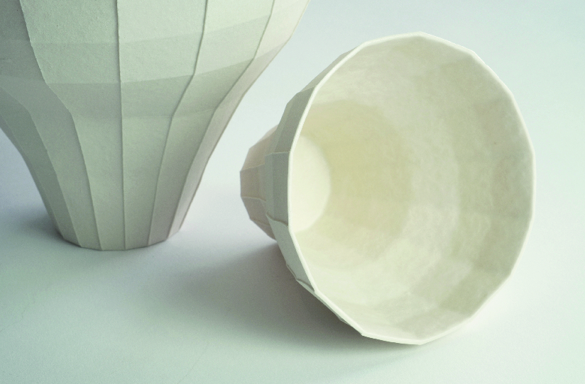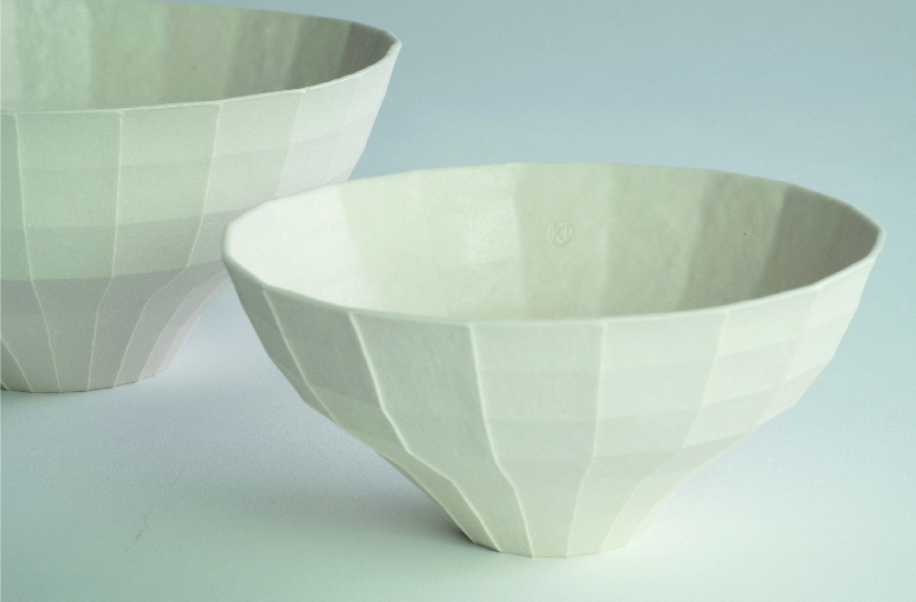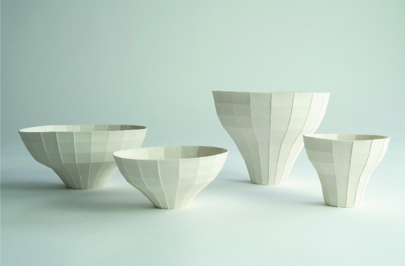 这一套格子器皿是我过去两年多一直在发展的纸系列的延续。我希望通过折纸的方式来创造不同的结构与空间,并利用陶土把结构转化为瓷器,把时间凝固,将本来脆弱和抽象的造型变成可用的器皿。 在创作的过程中,我一直在思考怎样可以更全面的去呈现纸张的肌理和它轻型的特点;不单是视觉上,也希望可以在触感上达到类似纸的效果,更忠于纸模型本来的模样,所以在这一个项目里,我尝试把纸加进瓷土里面进行制作。虽然纸的纤维会在烧制的过程中消失,但纸的痕迹却完完全全的保留下来,而且最终的成品也因此变得更轻薄。