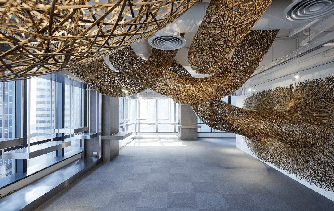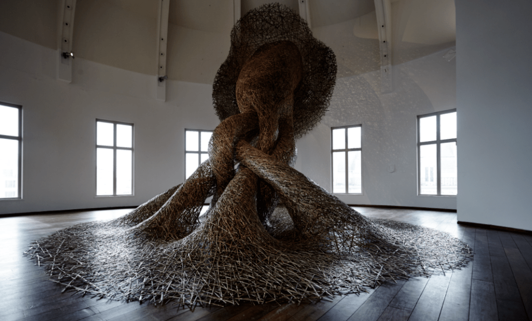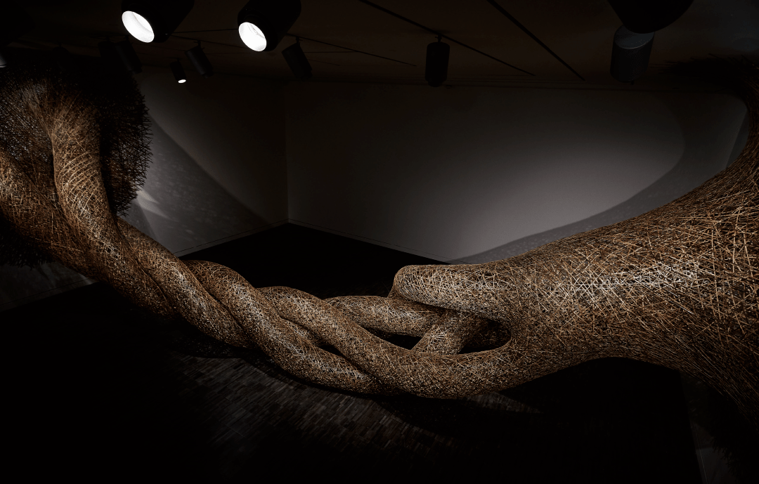 这个作品其实是用竹子经由手工编织而成,作品里的无数线条交织盘错,连绵不绝,形成了一个前所未有、生机勃勃的巨型装置。创造这个作品的艺术家名为四代田边竹云斋,他出生于一个日本传统竹工艺世家,本名田边健雄,是三代竹云斋的次子。2017年袭名四代田边竹云斋,在日本、美国、法国等地召开公布袭名展览会。作为竹云斋家族的第四代继承人,他一直在摸索更能凸显竹之存在感的方法,这种摸索的结果就是诞生了巨大的竹装置。而通过这些作品他想要表达什么呢?他说想表现栖息在竹子里的自然生命。