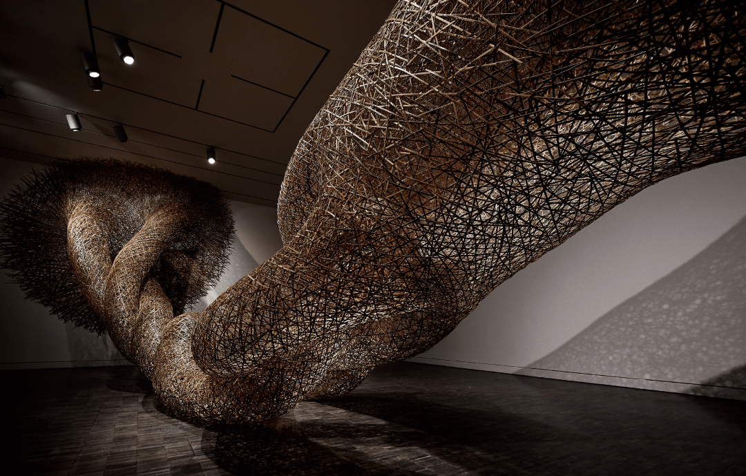 值得一提的是,田边先生在作品中使用的竹子都是回收来的。他用水来滋润、塑造这些竹子,将不同深浅的竹子结合,缠绕成结,展览会结束后,使用过的竹篾要全部完整地拆开,在下次的展览中继续使用。这是一种代表着循环和重生的艺术,竹子暂时失去形体,又在另一个地方以另一个姿态重生。竹子在一件件作品中历经了一次次生命的轮回。每个作品展览结束后,大概会有5%的竹篾损坏报废。于是田边先生会补充制作一些竹篾,“我从事装置艺术作品已经十年了,现在使用的竹篾是在这十年间积累下来的,像这样的循环使用所蕴含的生命延续的意义,是我创作中重要的议题。”
