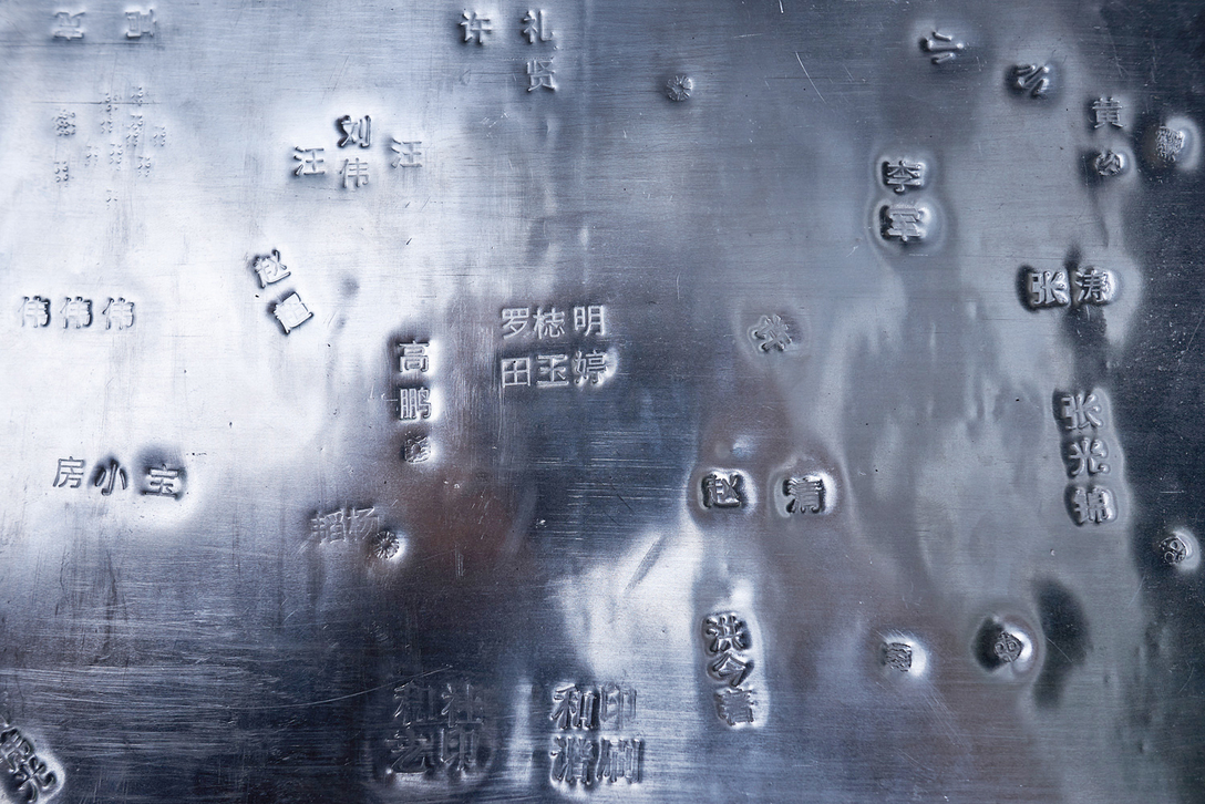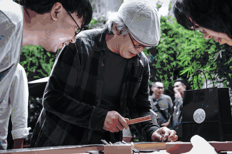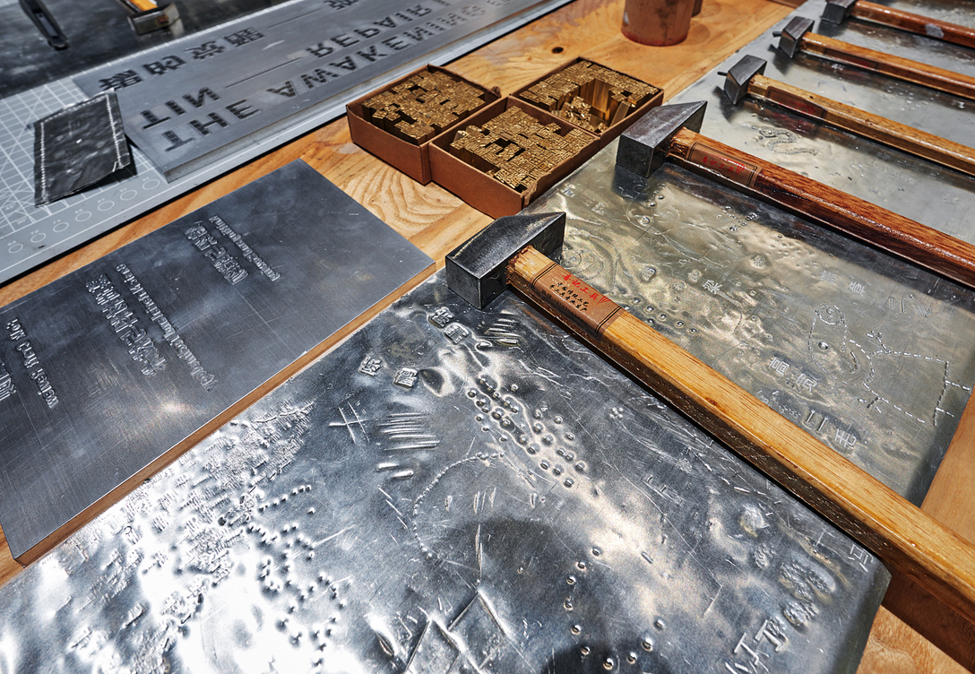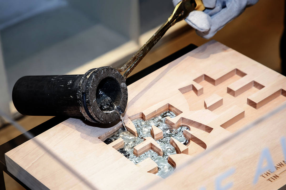 签名的方式不是写,而是敲。来宾们的姓名被刻制成黄铜活字,现场敲击深印在锡板表面。对多数人来说,这是他们与锡这种金属的首次正面刚。