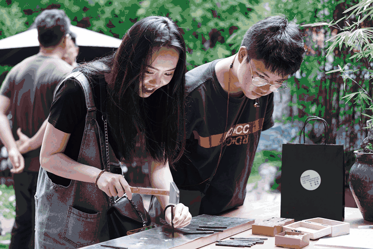 现场分分钟都是高光时刻,非要在高光中再加追光大概得属熔锡铸字仪式了。“锡木作”项目发起人刘志炼,与锡木作产品合伙人、首席工艺师罗梽明一同将熔化的锡浇铸入刻有“弥生”二字的木板,火热的锡液在文字中流动、充满文字的每一个笔画,并慢慢与其融合成一个整体,最后冷却凝固定型,宣告展览正式启幕。