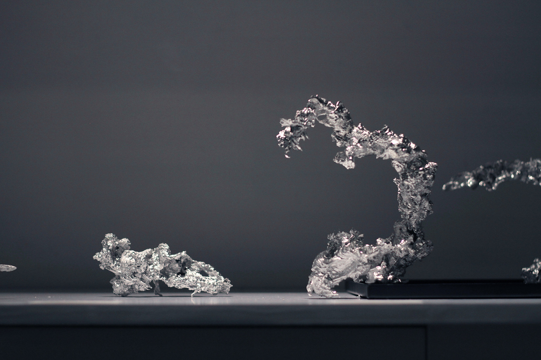 每一个形态各异的“爆款”或干净利落、或造型诡异,均任凭锡与水相遇时的角度、速度、温度随机决定,独一无二难以复制,却也自有不同系列感,炫酷得一塌糊涂。