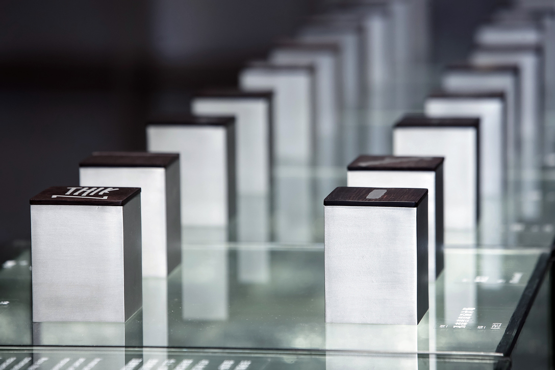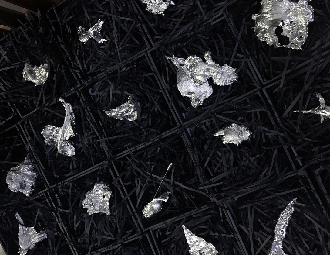 将锡液爆炸实验衍生的小块锡爆炸物,制成饰品,被我们叫做“爆款”。受邀到现场的嘉宾均获赠一枚,成为了此次展览开幕式的一个惊喜彩蛋。