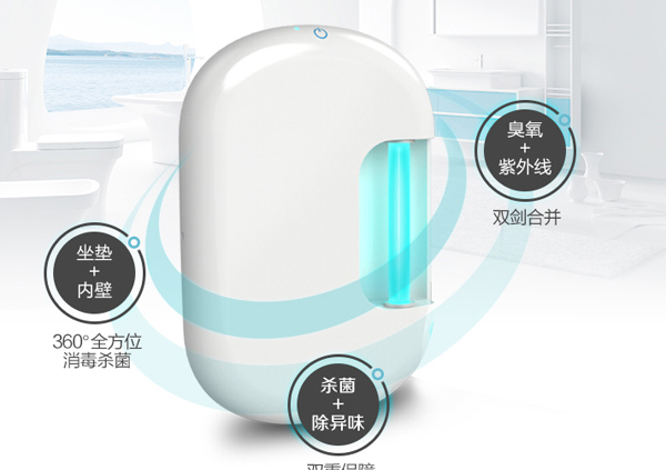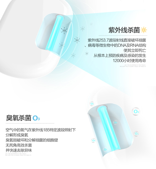 佳净马桶杀菌器紫外线杀菌和臭氧杀菌组成超强双重杀菌系统,杀菌率可高达 99.99%;同时,它呈半球形辐射,既可给马桶座圈消毒,也可给马桶内壁消毒。