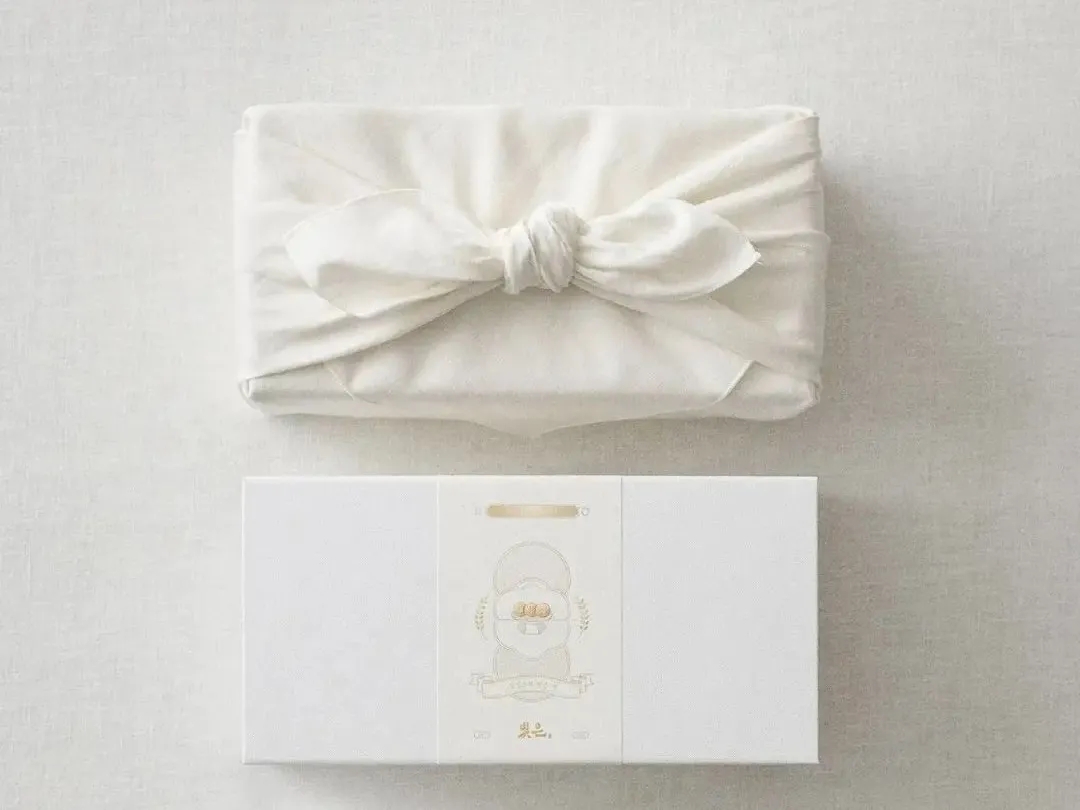 这套礼盒主体白色包装用红色缎带装饰,有很好的点睛作用,外包装使用织物代替购物袋,可重复利用。