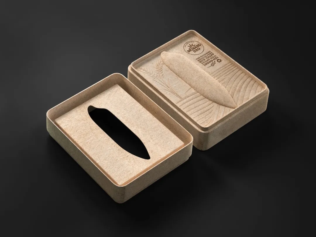 这种包装是用脱壳过程中产生的稻壳制成的,其内盖上有米粒形状的浮雕。盒子还可用作纸巾盒,非常环保。
