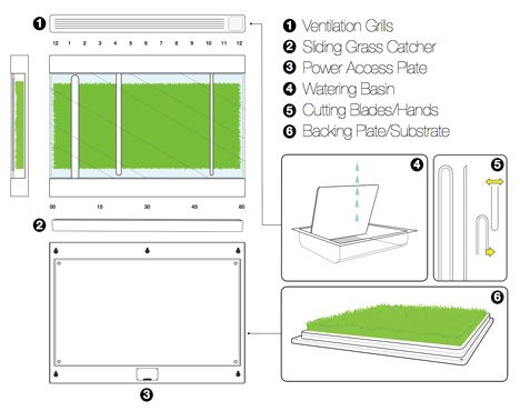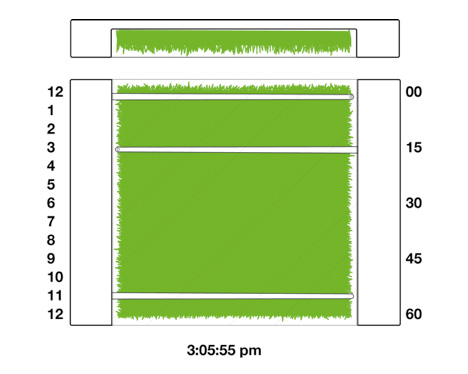 Researching for this article I came across the Treehugger post on Ustatic’s Wall Grass Concept. You must understand this concept before you can digest the Hour///Gras Living Wall Clock. Based on Ustatic’s theory that growing grass at home is beneficial, this concept clock encourages you to grow either grass or other suitable plants in a stainless steel and glass body frame and hang it on a wall. The hour and minute hand pass over the patch of grass and trim it via their sharpened edges and help maintain a pre-set level of grass-blade length.