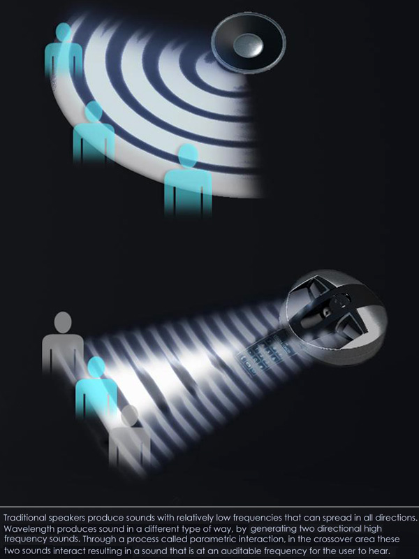 As a substitute ‘Wavelength’ uses a directional (parametric array) speakers and a directional (parabolic) microphone to transmit and receive audio. This allows the user to engage in a completely private conversation through this device without having to hold or wear anything, making tasks like writing a note on a piece of paper or typing on the computer while on a call easier. During a conversation ‘Wavelength’ (with the help of a camera and rangefinder) will track the users face. A two axis pivot allows ‘Wavelength’ to aim the speaker and microphone accordingly. A detachable display and number pad can magnetically dock to the front of the device for charging. In addition the user can choose to activate the speaker and microphone on the detachable remote, if they wish to use the remote as a traditional cordless phone.