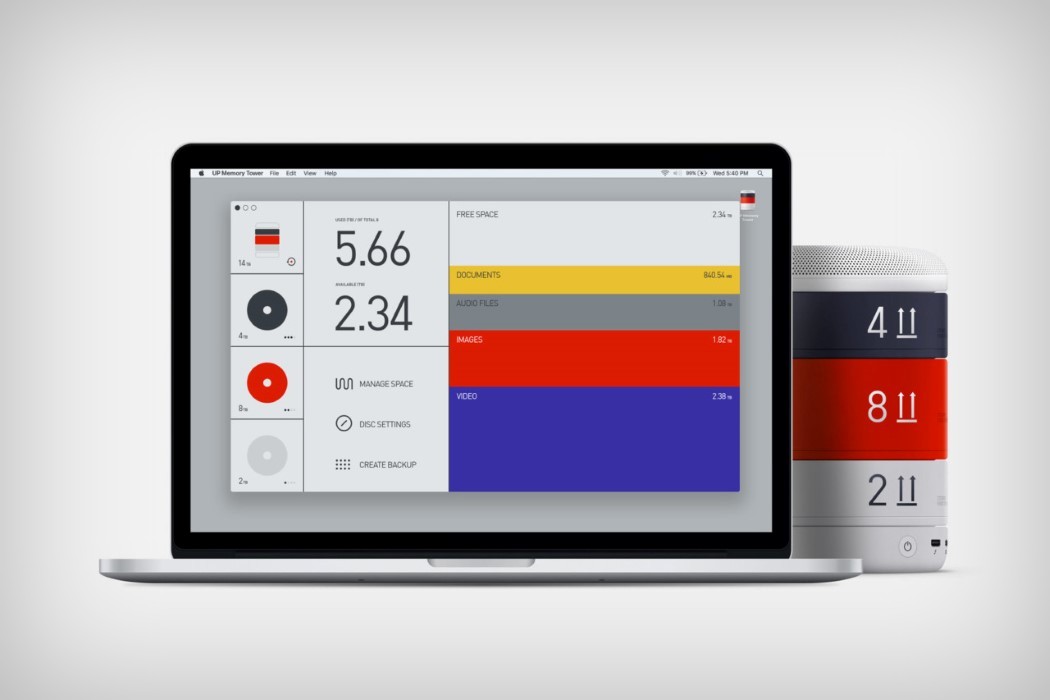 The disks range from 1 to 8 terabytes of storage (there’s even a speckled 2Tb hard disk for LeManoosh lovers!) and the color coding helps to let you segregate the drives based on content. The drives stack on top of each other, and connect via the base to a laptop or desktop, where an incredibly intuitive and beautiful UI makes it easy to configure and control your data. Designed clearly for creatives, the UP Memory Tower is absolutely perfect for photographers, video editors, designers and others who frequently work with large file sizes. In fact I’m writing a letter to Anton right now to start building prototypes for mass manufacture!