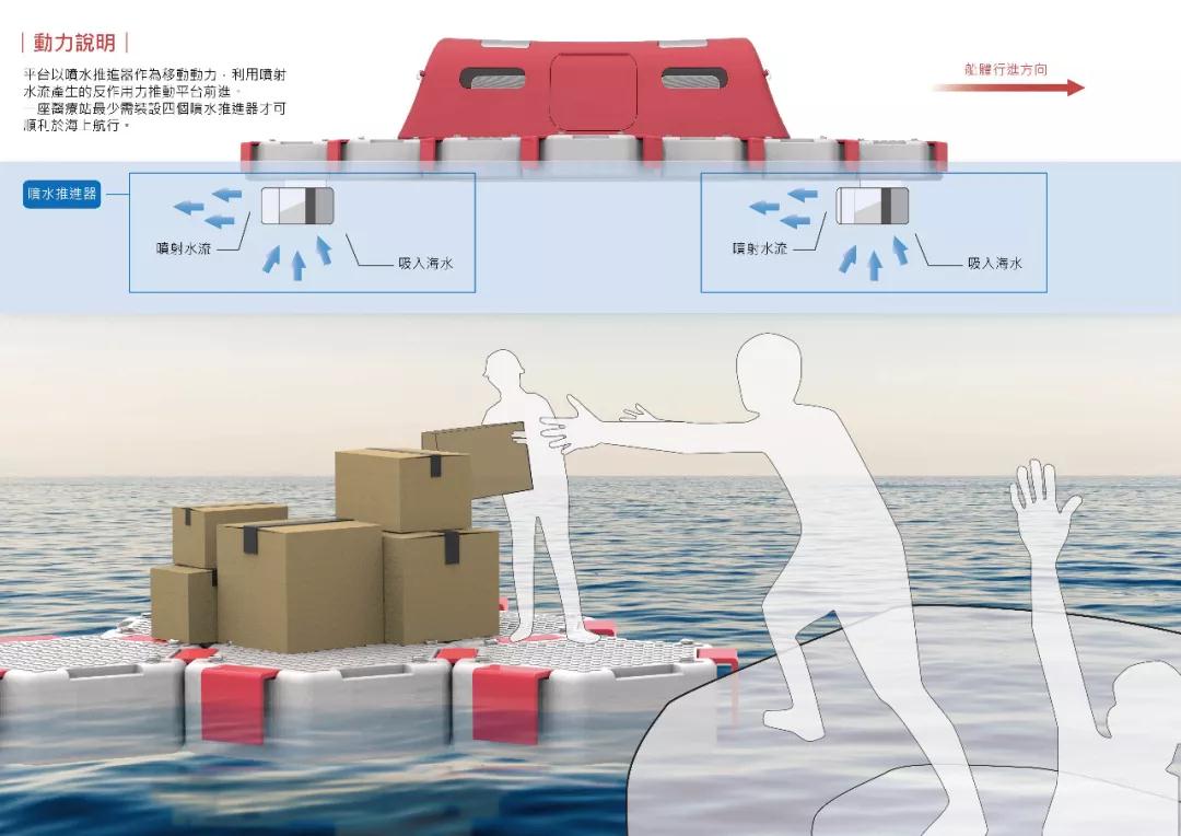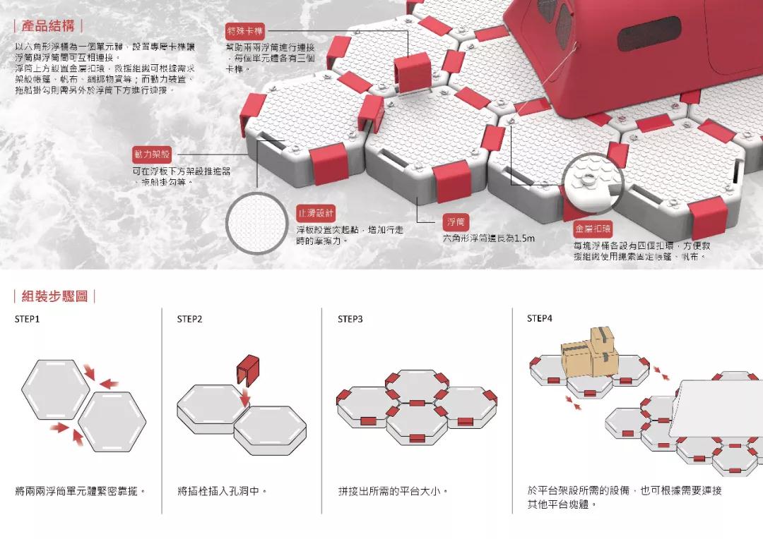 MARINE RESCUE PLATFORM是一款為協助難民而設計的模組化海上救援平台,救援組織可根據需求拼裝平台、配件及平台上方架設物,給予難民不同功能上的協助。透過拼裝MARINE RESCUE PLATFORM零件,可達成海上醫療站、船體拖動、物資運送多種型態,為海上漂流的難民提供物資救助及醫療協助,以防悲劇的發生。