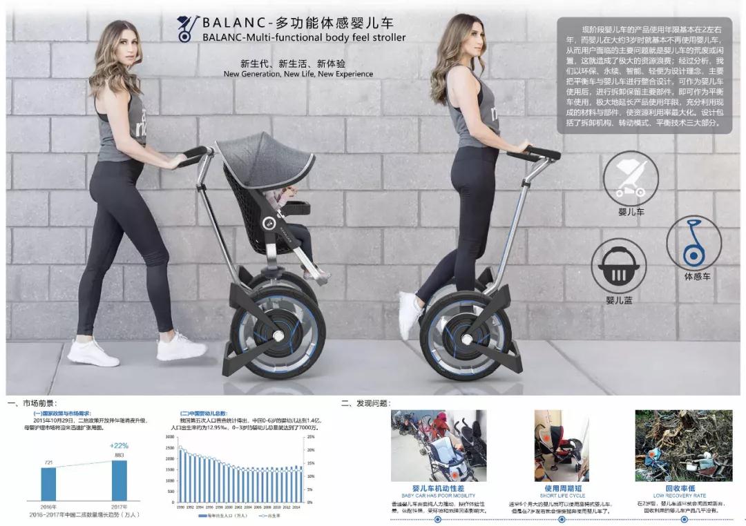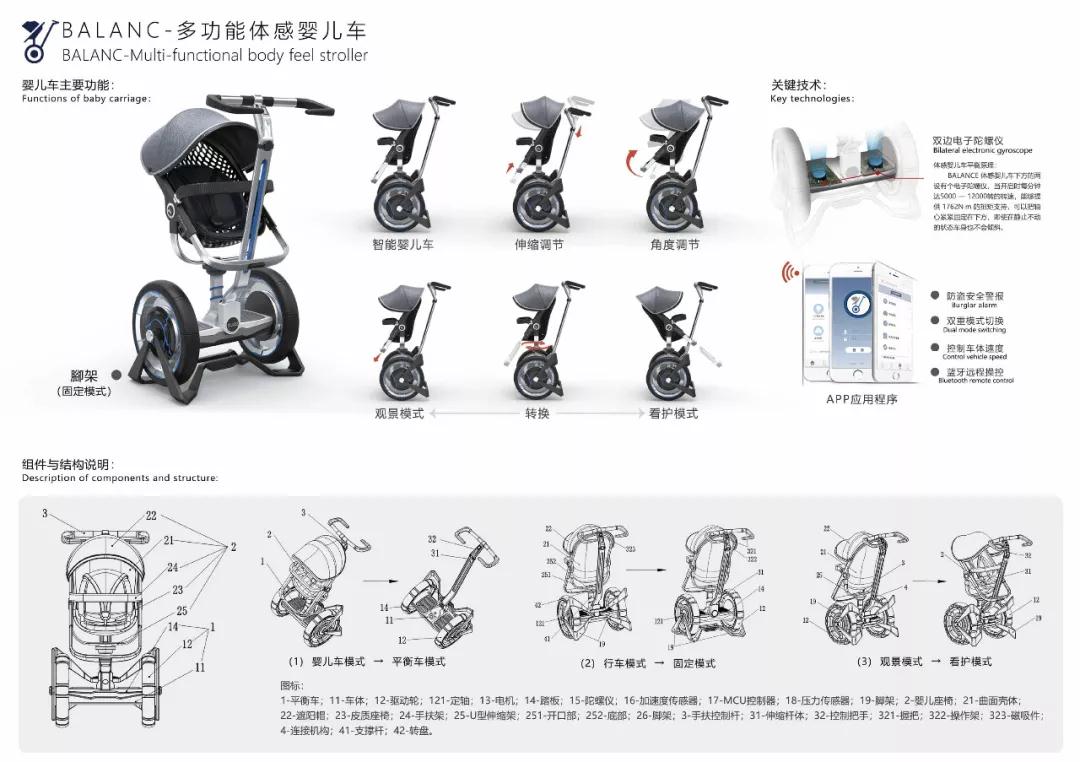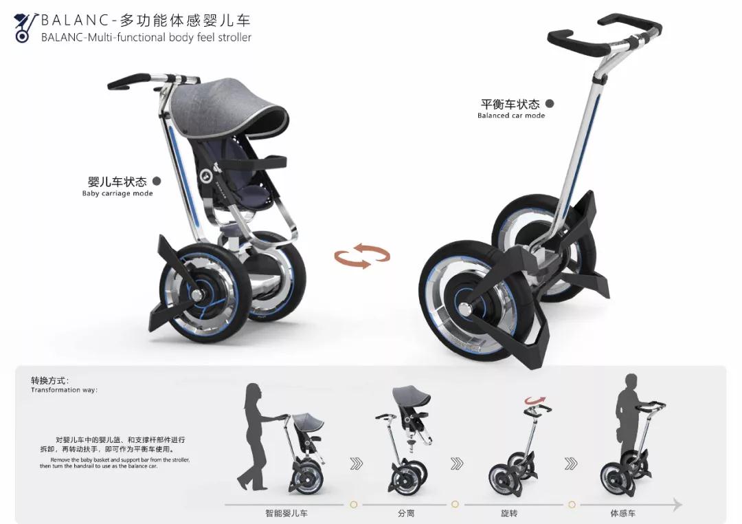 生活中我們發現嬰兒車的產品使用年限基本會在1~2左右年,嬰兒在大約3歲時,嬰兒車就會荒廢或閒置不用,這就造成了極大的資源浪費;從而經過研究,我們以環保、永續、智慧、輕便為設計理念,設計了一款體感式嬰兒車,可在作為嬰兒車使用後,進行拆件保留主要部件,即可作為平衡車使用,極大地延長產品使用年限,充分利用現成的資料與部件,使資源利用率最大化。設計包括了拆件機构、轉動模式、平衡科技三大部分。