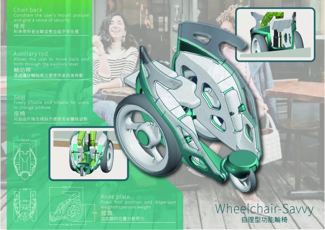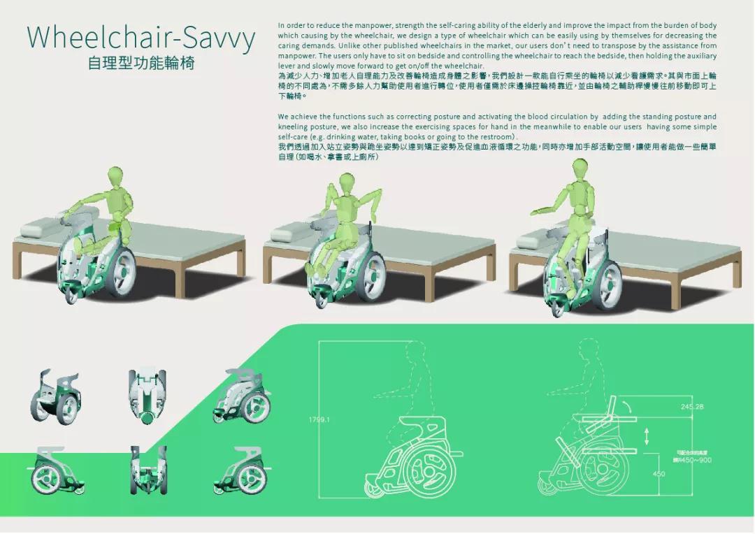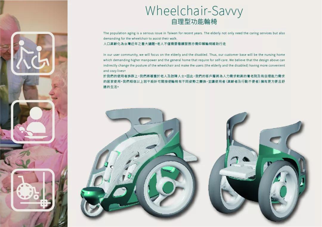 人口高齡化為台灣近年之重大議題,老人不僅需要看護服務亦需仰賴輪椅補助行走。為減少人力、增加老人自理能力及改善輪椅造成身體之影響,我們設計一款能自行乘坐的輪椅以減少看護需求。其與市面上輪椅的不同處為,不需多餘人力幫助使用者進行轉位,使用者僅需於床邊操控輪椅靠近,並由輪椅之輔助桿慢慢往前移動即可上下輪椅。我們透過加入站立姿勢與跪坐姿勢以達到矯正姿勢及促進血液循環之功能,同時亦增加手部活動空間,讓使用者能做一些簡單自理(如喝水、拿書或上廁所)。於我們的使用者族群上,我們將著重於老人及肢障人士。因此,我們的客戶層將為人力需求較高的養老院及有自理能力需求的居家使用。我們相信以上若干設計可間接使輪椅有不同姿勢之變換,並讓使用者(高齡者及行動不便者)擁有更方便且舒適的生活。