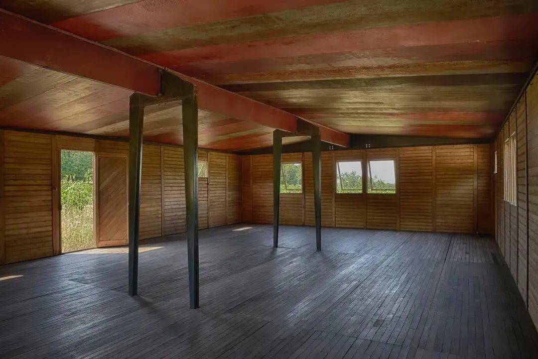 1930年代起,Prouv%uE9 开始了“预制房屋”的探索,运输至目的地后便可快速就地组装。设计巧妙的金属组建便于建筑物的拆卸、移动和改装,钢作为较稀有的材料被保留用于制作折叠的金属板框架,其中插入标准化木板,最大的设计特点则是房屋中央承重的轴向门式刚架结构。该建筑系统于1939年获得专利。