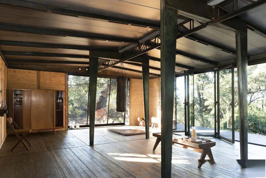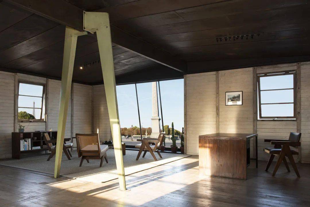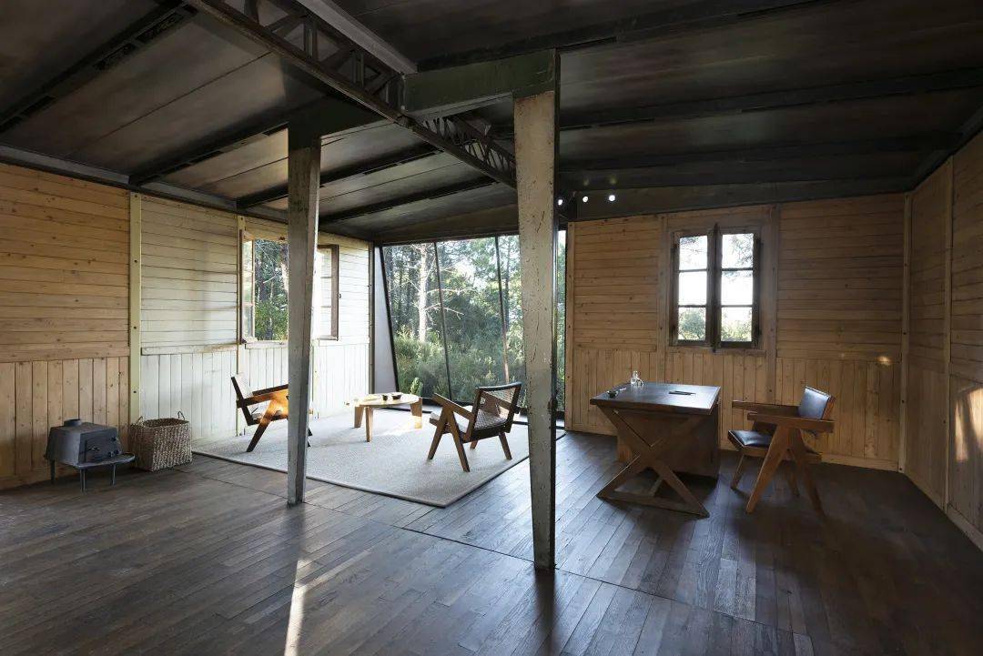 Jean Prouv%uE9和Pierre Jeanneret,F 8x8 BCC可拆卸房屋,1941年。带有中央门式刚架,房屋内部有Jean Prouv%uE9的Tout bois chair,1941年;Jean Prouv%uE9的可拆卸椅子CB22,1947年;Charlotte Perriand的凳子,大约1955年;Pierre Jeanneret的Forme Libre自由形式餐桌,1941年;灯来自Serge Mouille。