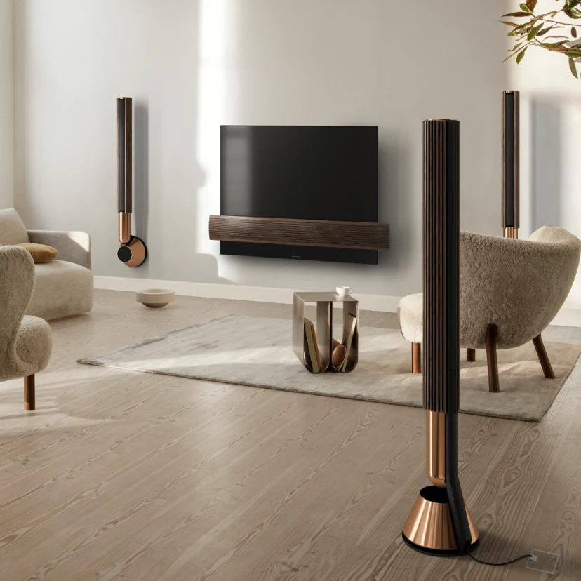 这一款超纤细的扬声器具有变革性的驱动单元配置,并经由 Bang & Olufsen 工程师进行微调。极为小巧玲珑的驱动单元经过特别设计,可呈现全音域的声音,无论环境如何,都可传递出清晰音质。无论面向何处,4 英寸的低音扬声器都可产生全向低频声音,小巧的 1.45 英寸中音驱动单元和 0.6 英寸的高音驱动单元位于顶部,以尽可能传递出强劲震撼的音效。