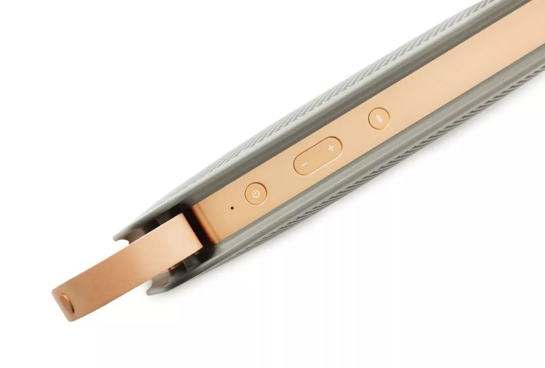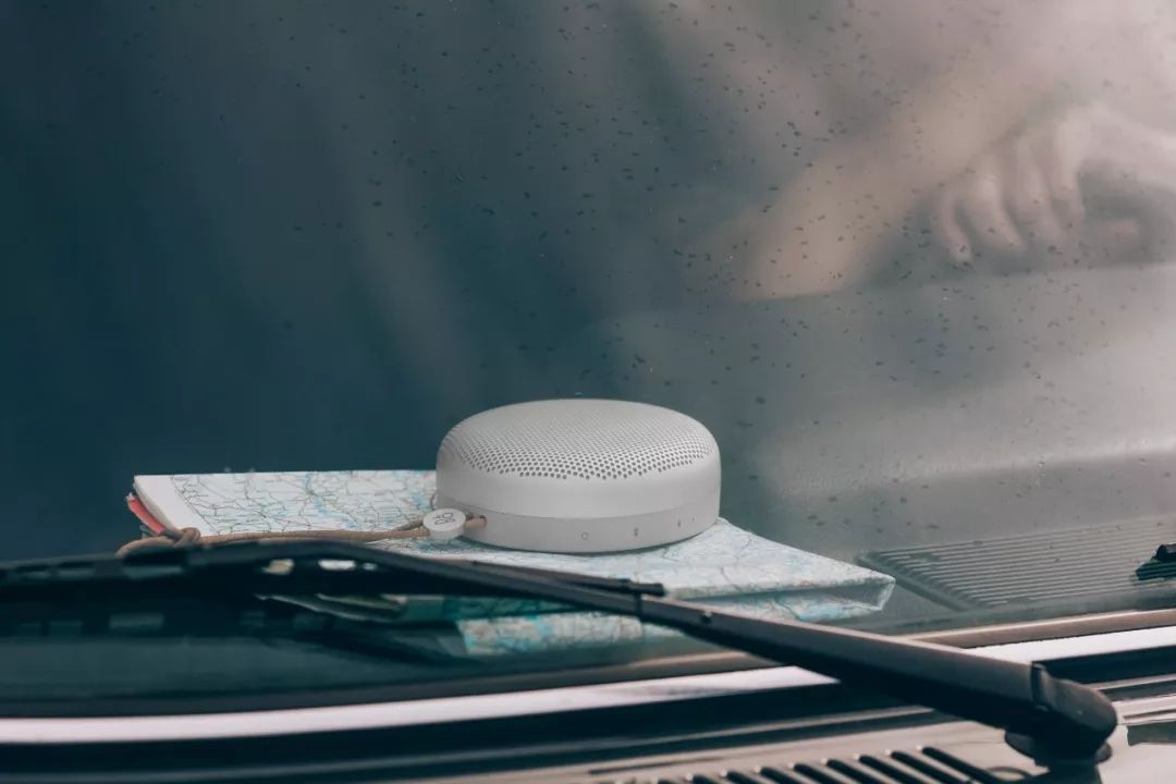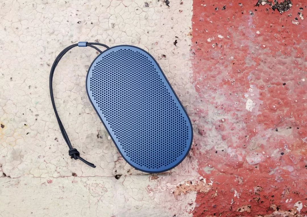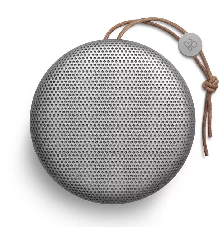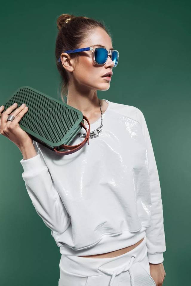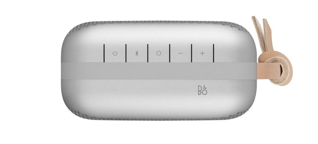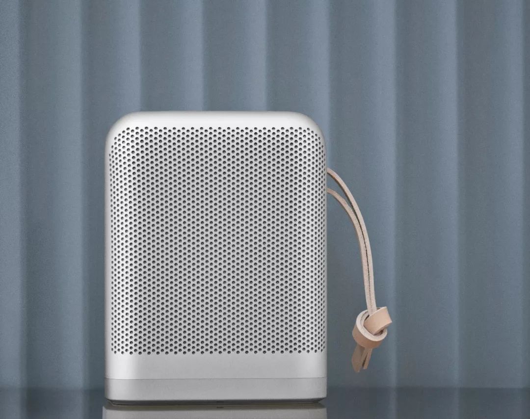 为B&O设计的便携式蓝牙扬声器,配有皮质表带。