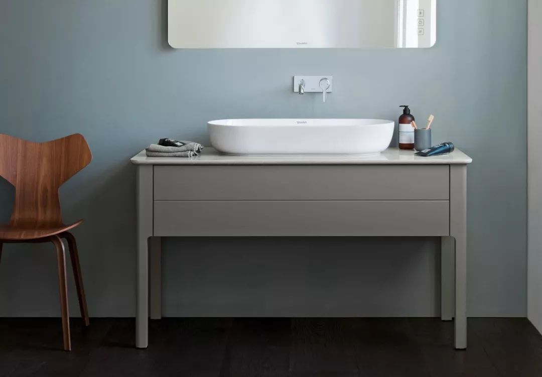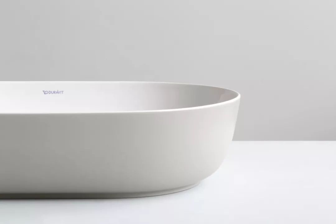 一个全面的系列,包括洗脸盆、镜子和浴室家具。这三种大小的椭圆盆,都是由非常薄的DuraCeram瓷制成。在釉的选择上有缎纹、白色、灰色或砂色调,桌子台面则是用石英石或实木制成。