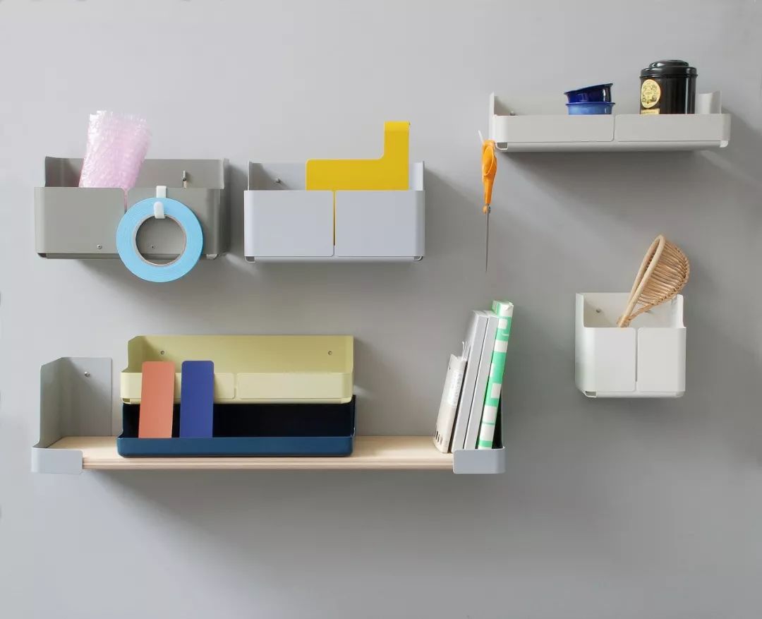 各种尺寸的壁挂式或独立式搁板和储物盒。