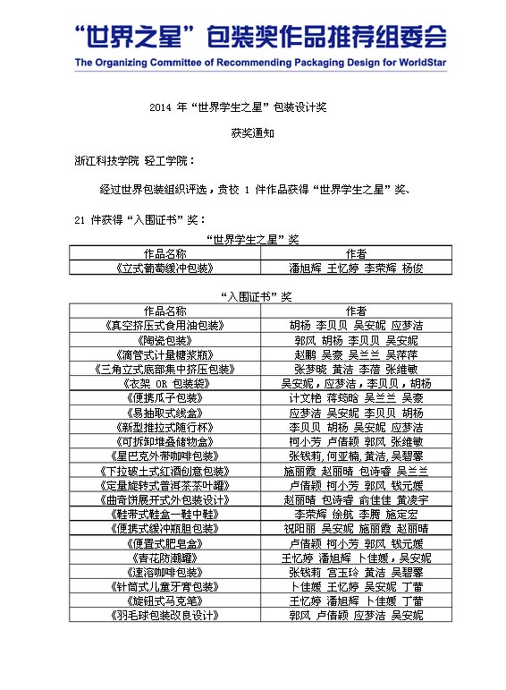 淘博总监及浙江科技学院设计系教师协同指导的作品获得2014中国区唯一一名“世界学生之星”奖