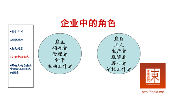 使学员认识到,虽然每个人都参与了企业工作,但人们在企业中所扮演的角色是不同的。
